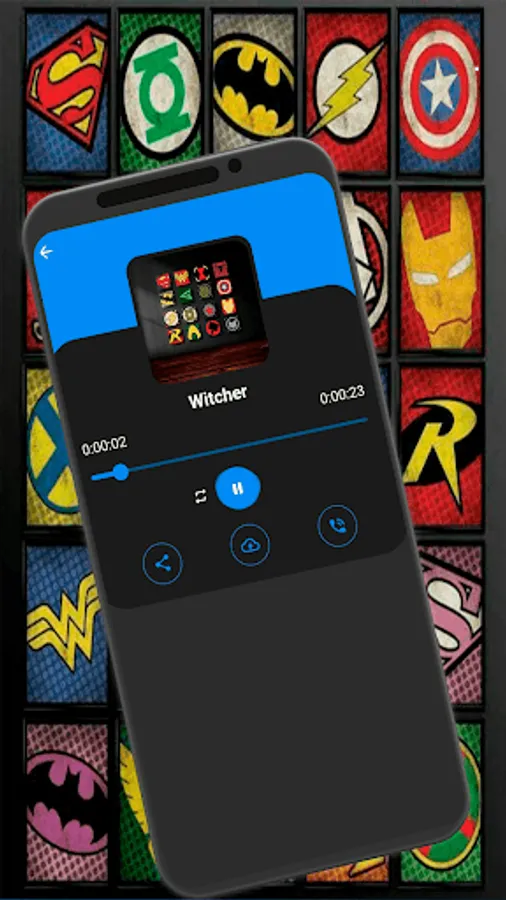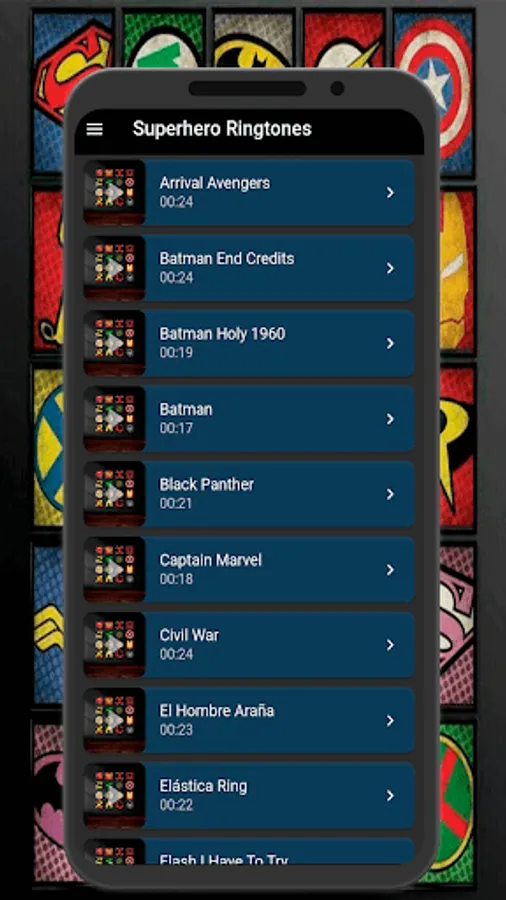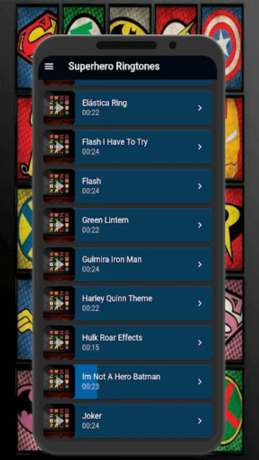 The ringtones that you will find on the playback screen of your cell phone, you can apply each sound, be it notification, alarm, call, message effects, jumps, reactions, comedy, jokes, trumpet, whistles, strange noises, environmental sounds or in the background and more, reproduces the most heard superhero tones from classics to the newest sound.