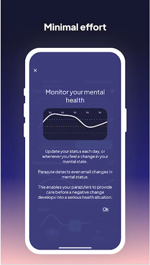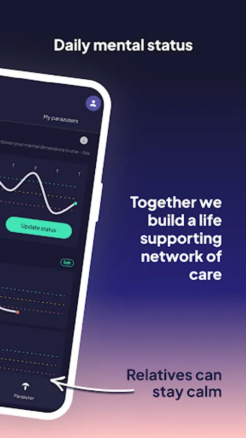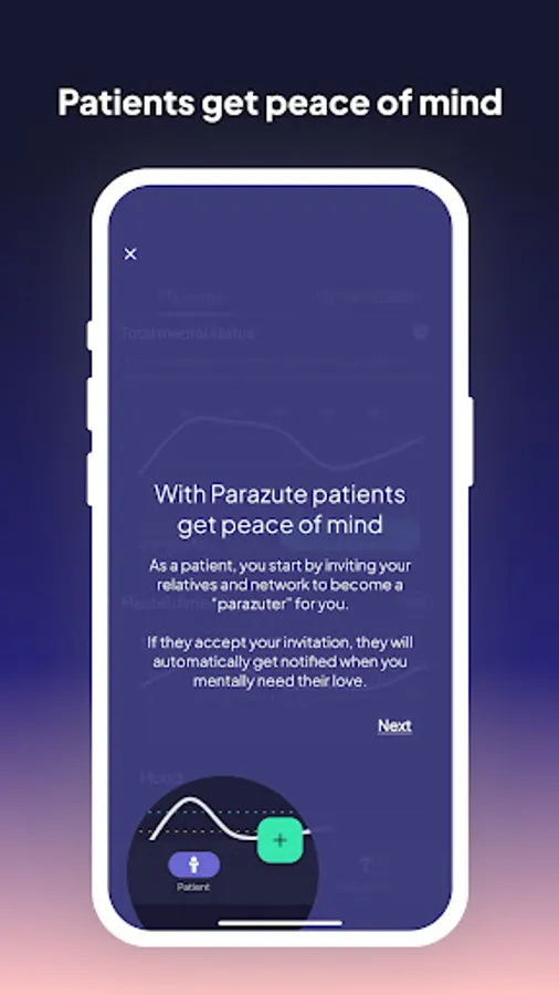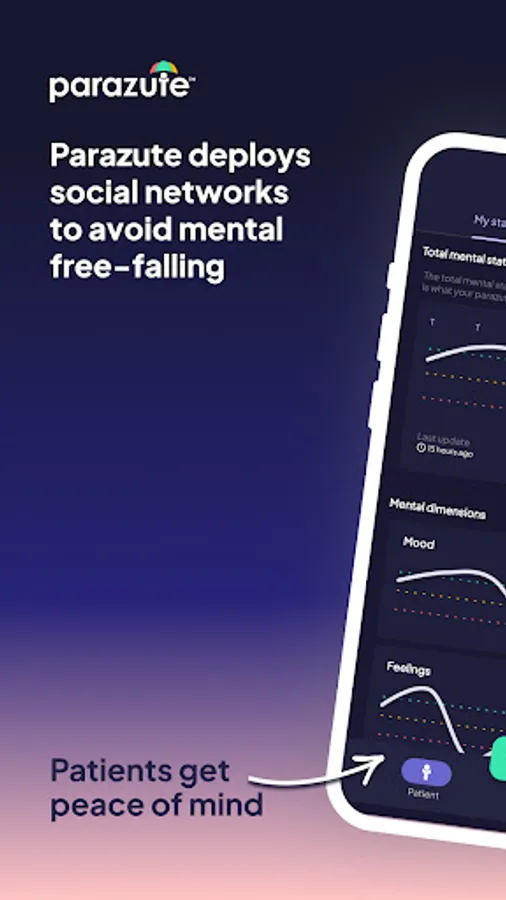 The Parazute app reports the mental health status to the network based on a few daily inputs. It is less than one minute of effort for the patient. In case of adverse development in mental status – the self-selected “Parazuters” made up of family, friends, and even caregivers that the patient already trust today, get notified that the patient need some love.