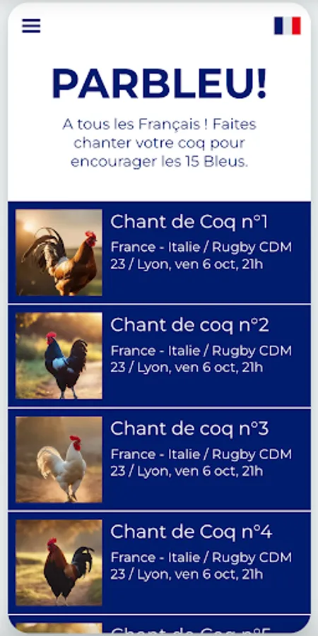 The common point between all the athletes who represent France is to have the rooster embroidered on the heart. PARBLUE! is the mobile application that produces and offers original rooster crows for supporters, with the aim of encouraging all these French athletes in an innovative, effective and festive way during international competitions. PARBLEU! is the sound DNA of Les Bleu(e)s.
