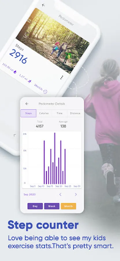 ✓ Child Fitness Tracker illustrates step counter, calories burned, and total distance