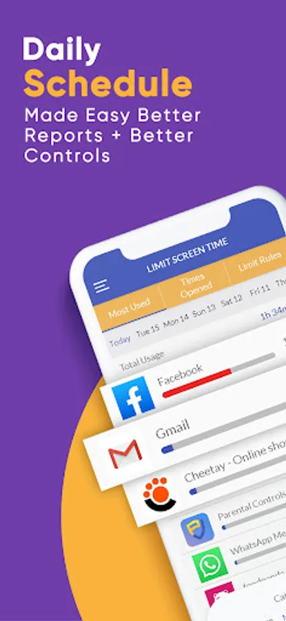 ✓ Screen Time Limit sets app time limits or total screen time per day
