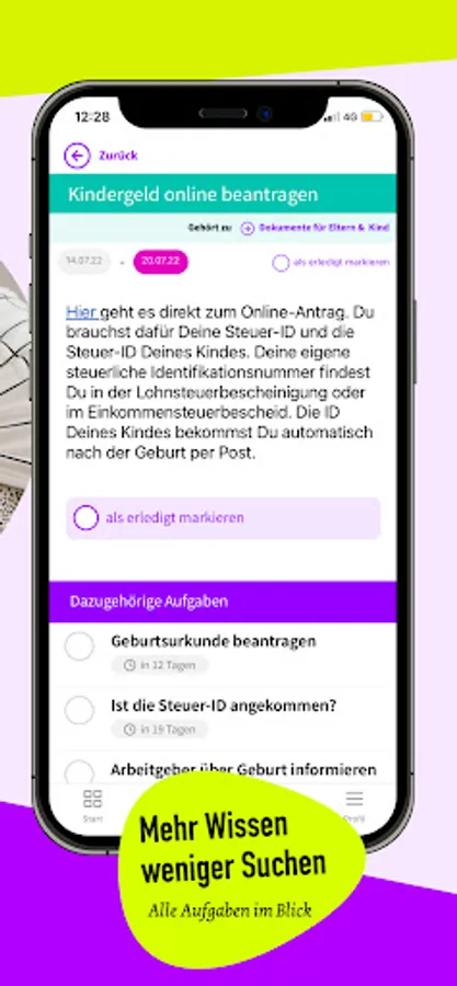Erhalte individuell auf Dich zugeschnittene Aufgaben. Je nach Geburtstermin oder Alter Deines Kindes, Beschäftigungsstatus, Familienstand und in Zukunft auch nach Wohnort.