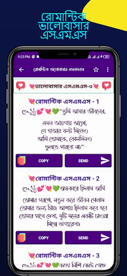 অনেকেই আছেন যারা মনের মানুষকে খুশি রাখতে চান কিন্তু কিভাবে করবেন তা বুজেন না। তাঁদের জন্য এই অ্যাপ টি। কেননা মনের মানুষকে খুশি করতে দরকার প্রেমের কবিতার। এমন যারা আছেন তাঁদের জন্য এই অ্যাপ টি কেননা তাঁদের জন্য আমরা নিয়ে এলাম সম্পূর্ণ ভালভাসাময় এস এম এস। এই অ্যাপ এ সহজেই কপি করে যে কাউকে ছড়িয়ে দিতে পারেন আপনার ভালভাসার অনুভূতি।