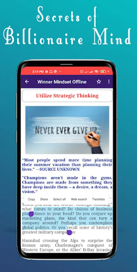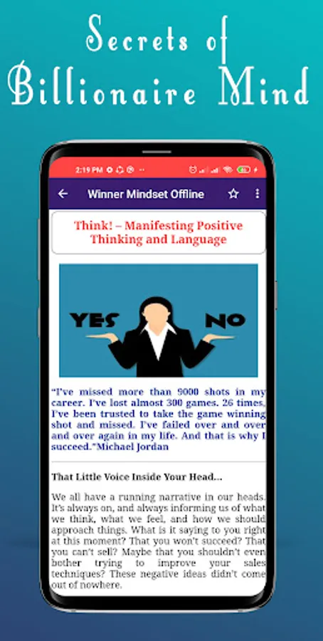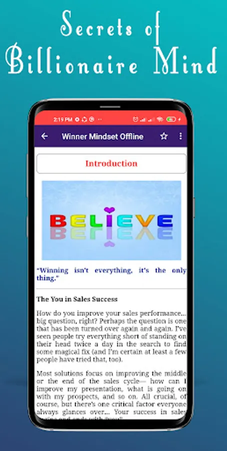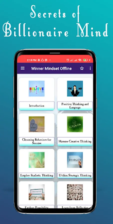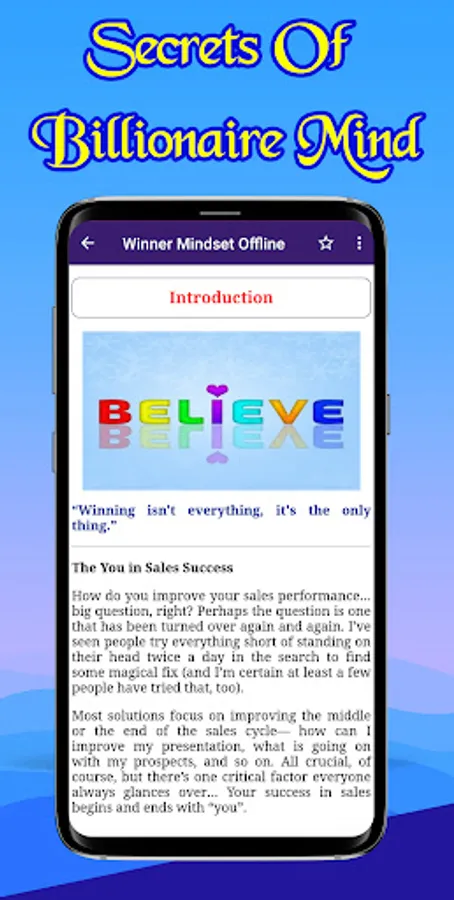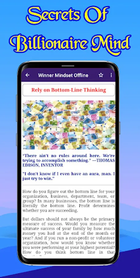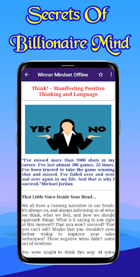 How to get a winner's mindset and how to become a successful man? It is a general question of every man. For this reason, We made this Secrets of Billionaire Mind app so that you can get the mindset for the winner. what are the Secrets of Billionaire Mind? or what is the mindset of a winner? This question answer is "Secrets of Billionaire Mind focus on winning and not otherwise. So you need to focus on winning apps that are secrets of millionaire mind and self-made millionaire, otherwise, you will end up being another loser."