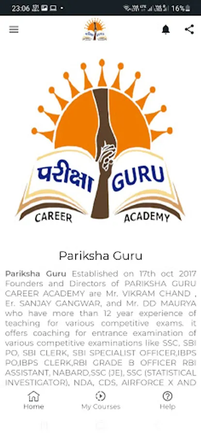 Established on 17th oct.2017 Founders and Directors of PARIKSHA GURU CAREER ACADEMY are Mr. VIKRAM CHAND , Er. SANJAY GANGWAR, and Mr. DD MAURYA who have more than 12 year experience of teaching for various competitive exams. it offers coaching for entrance examination of various competitive examinations like SSC, SBI PO, SBI CLERK,SBI SPECIALIST OFFICER,IBPS PO,IBPS CLERK,RBI GRADE B OFFICER ,RBI ASSISTANT,NABARD,SSC (JE), SSC (STATISTICAL INVESTIGATOR), NDA, CDS, AIRFORCE X AND Y GROUP, ARMY, RAILWAYS, CAPF(ASSISTANT COMMANDANT),STATE POLICE OFFICER EXAMS, UPTET ,CTET ,TGT AND PGT EXAMS,FOUNDATION COURSES, CAMPUS PLACEMENT EXAMS, PARIKSHA GURU CAREER ACADEMY is a new venture by us to cater to the demand and expectation of the students aspiring for competitive exams and focuses to be the best coaching center in BAREILLY. Apart from just a coaching centre, PARIKSHA GURU CAREER ACADEMY also focuses on the all-round development of the students through expert guidance and unmatched study materials issued from us. PARIKSHA GURU CAREER ACADEMY aims to be the best coaching centre in India with regards to preparations of SSC,SBI, BANK PO AND CLERK, IBPS SPECIALIST OFFICER, LIC, INSURANCE EXAMS,AIRFORCE, SSC (JE), SSC CPO,SSC (STATISTICAL INVESTIGATOR),RAILWAYS, FOUNDATION COURSES, STATE POLICE OFFICER EXAMS, UPTET ,CTET ,TGT AND PGT EXAMS etc. PARIKSHA GURU CAREER ACADEMY also provides the unique facility of Mobile friendly Android App Test Series to its students so that they can judge their skills anytime they want.