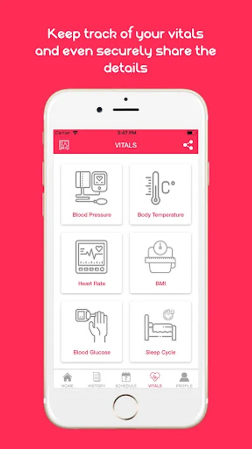 Vitals: Keep track of all your vital signs and even synchronize readings from wearables and monitoring devices.