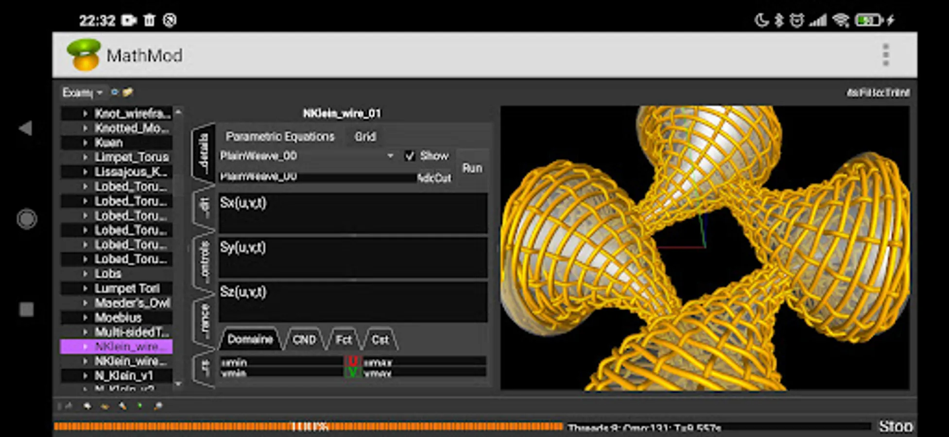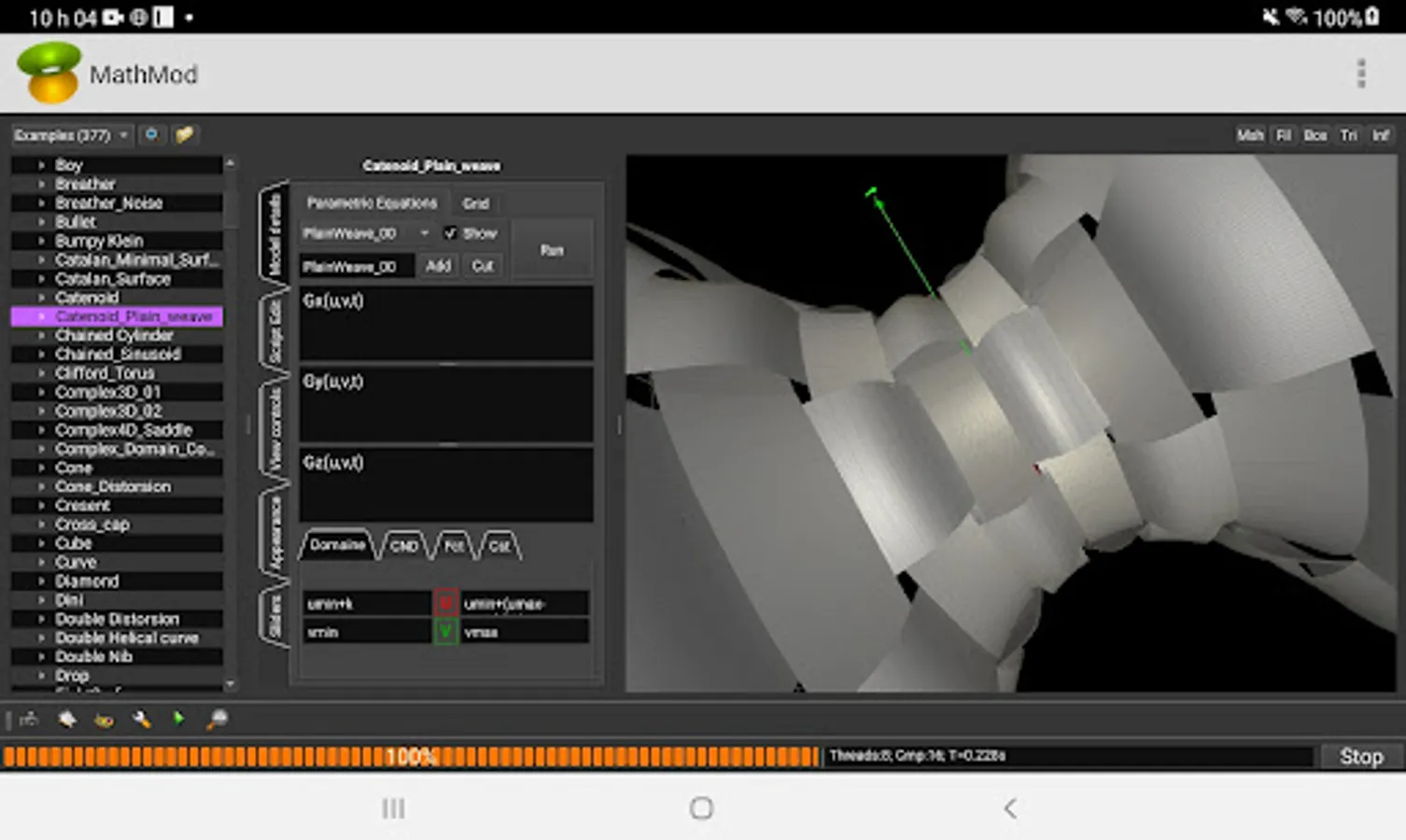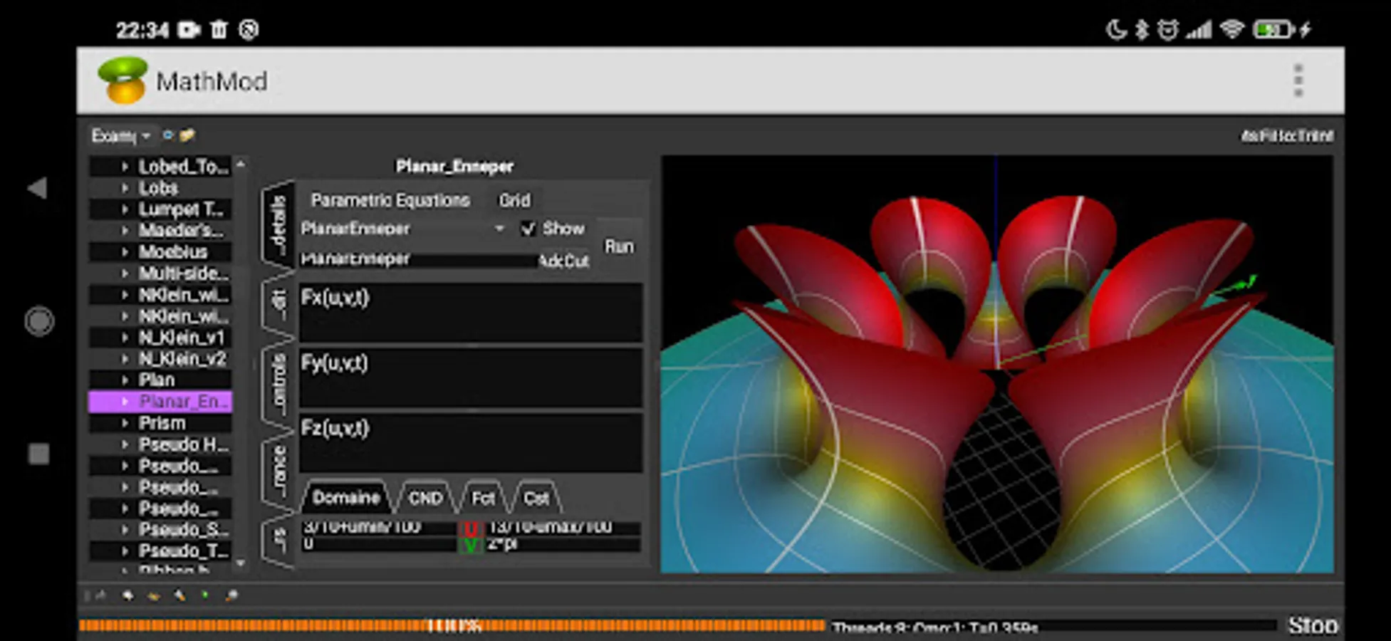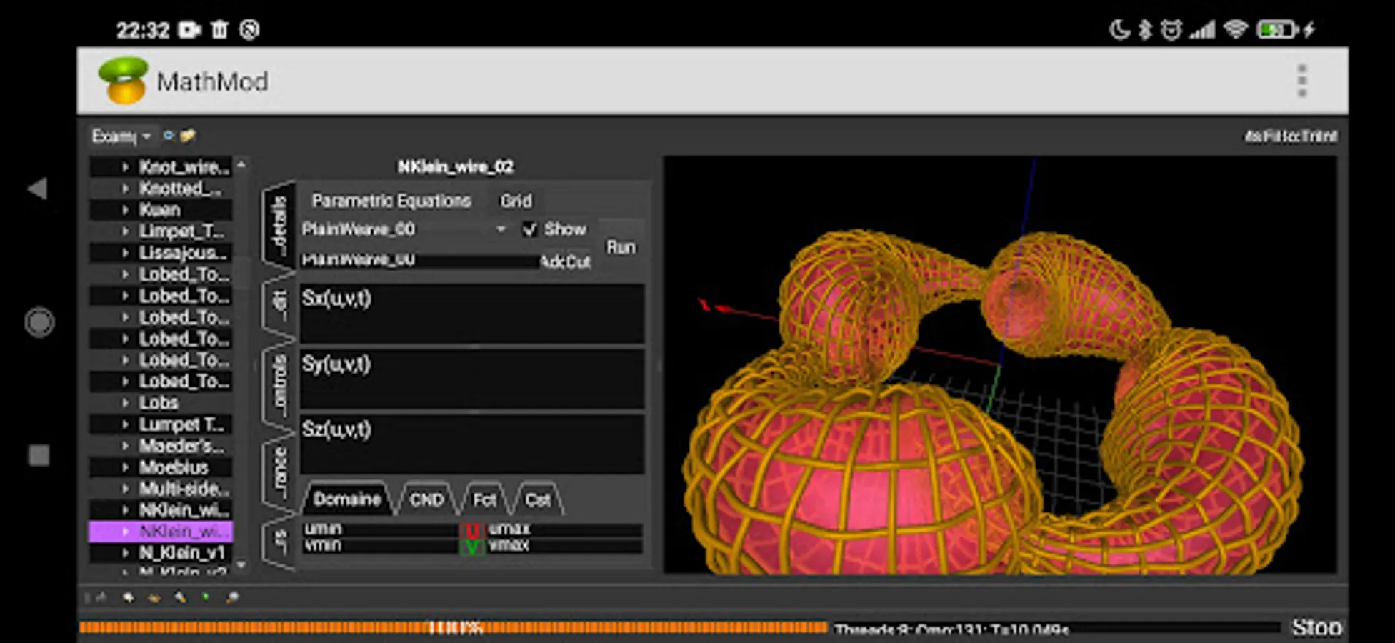 MathMod allows to plot 3D mathematical surfaces, described by implicit or parametric equations, and offers a very large database of model samples that can be generated with it.