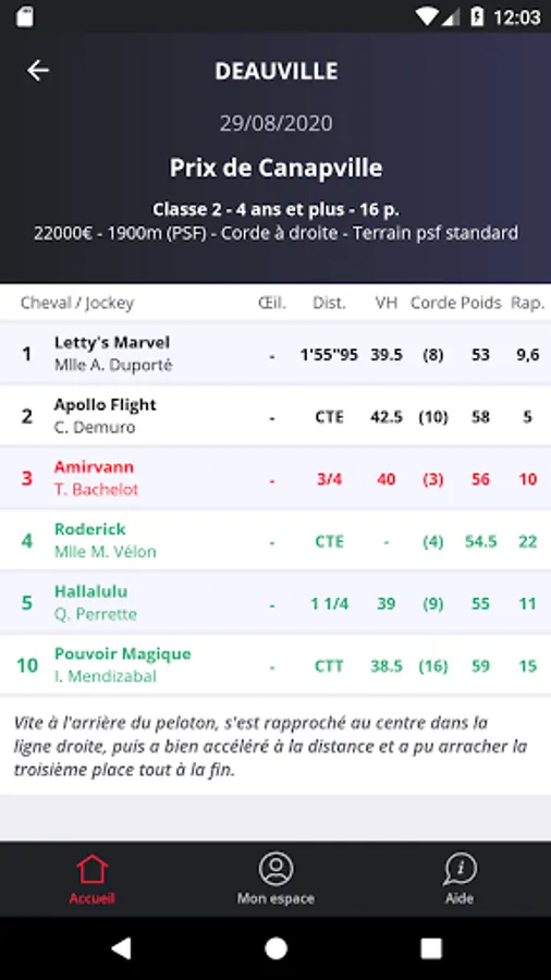 Evaluate a runner's form and value with their detailed performance. The horse, the opponents he meets today (the lines) as well as the top five of the race are detailed. Classification, name of horses, name of jockeys or drivers, blinders, ironing, sex, age, numbers, distances at the finish, winner's time, mileage reductions, handicap values, rope and final odds make up the detailed performance. Finalize your opinion with the commentary on the behavior of the horse during the race written by journalists Paris-Turf.