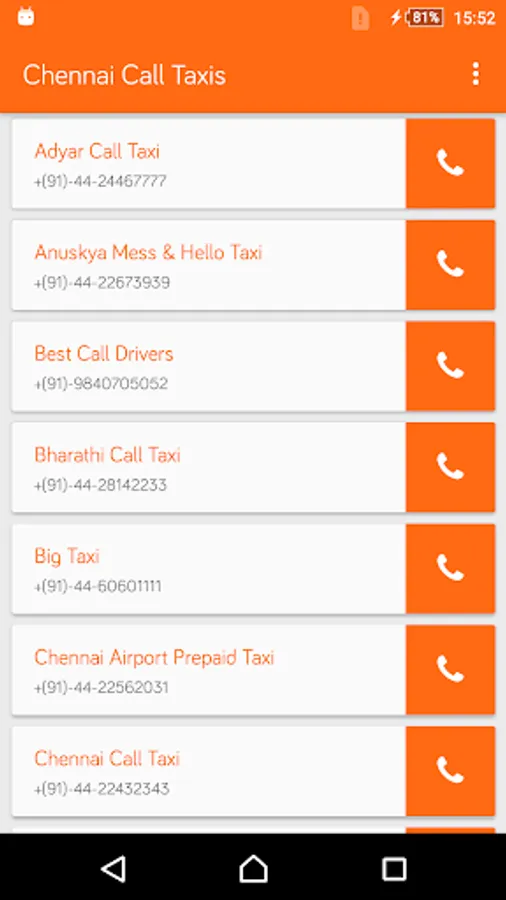 List of all Call Taxi Numbers in Chennai. Tap any of the items in the list and book a cab instantly.