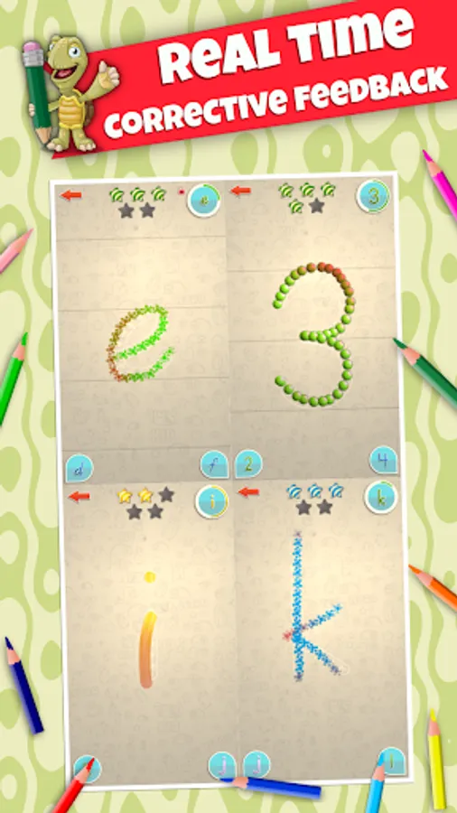 Our ABC and 123 tracing evaluation algorithms allow for an accurate and fun reward, using a 5 star rating for each exercise. This engages and motivates the kids to progress and to strive for more.