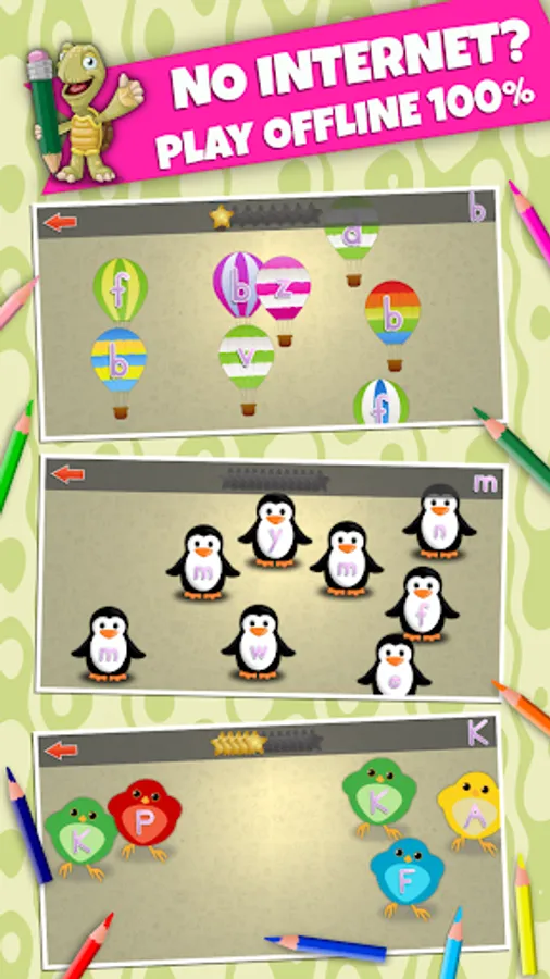 • 5 progression levels, color coded for each glyph that allows parents and teachers an instant evaluation of the progression and most exercised letters at the alphabet level.