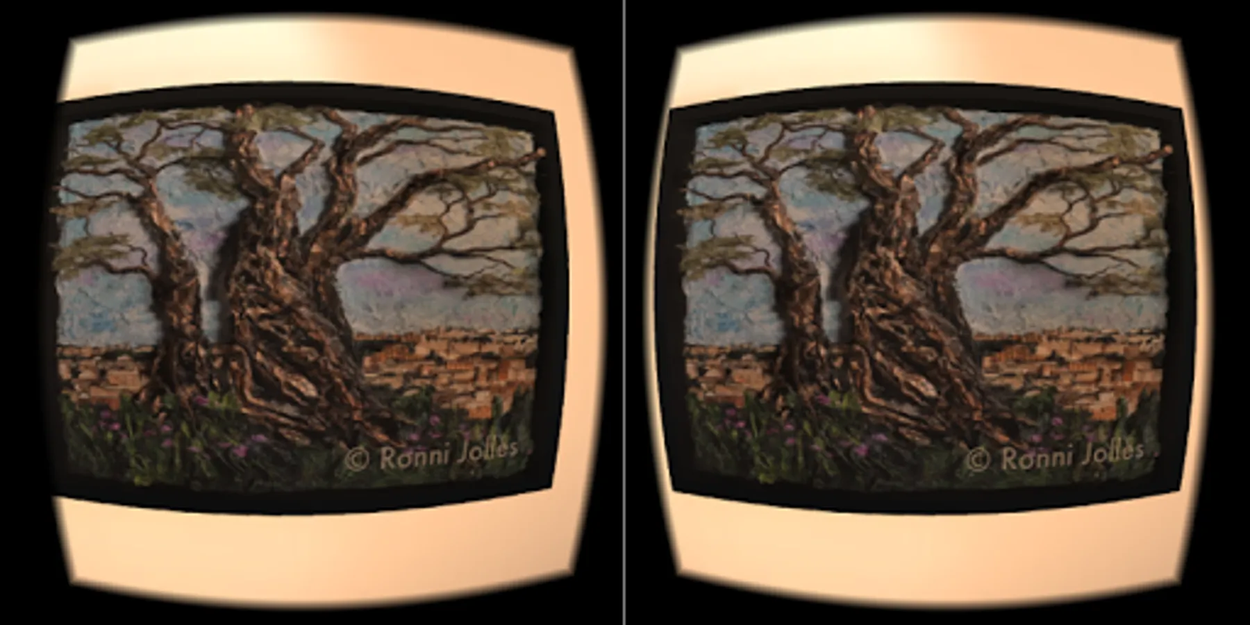 Using your smartphone with a virtual reality (Cardboard) viewer, experience a walkthrough of artist Ronni Jolles virtual gallery, Painting with Paper(tm): The Infinite Possibilities of Texture and Color. App created June, 2015.