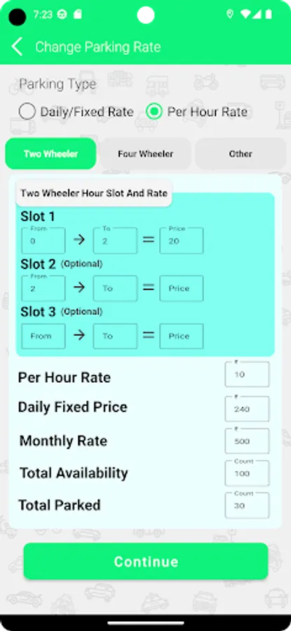 12. Options of Parking rate for (1) Three different initial slot hour range (2) per- hour (3) Daily/Fixed (3) Monthly rates