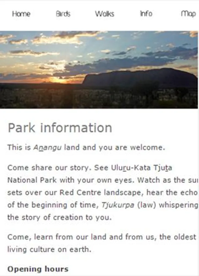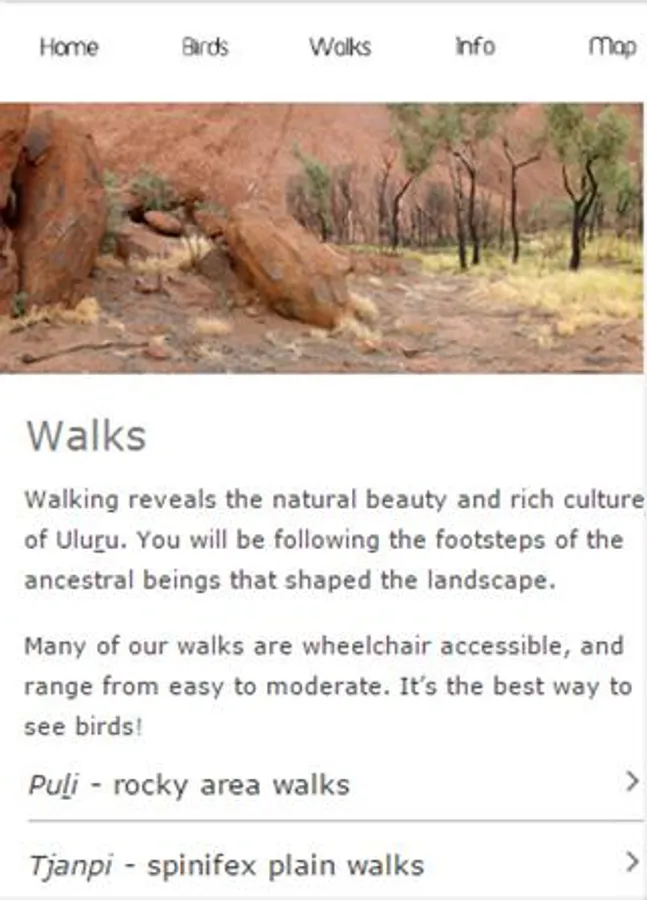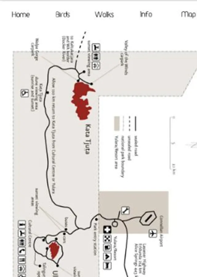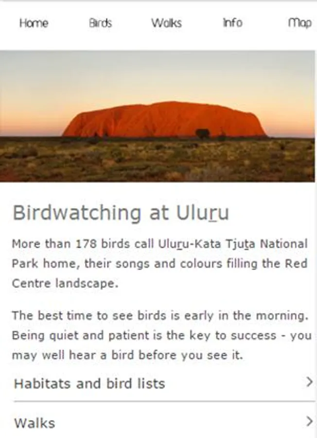 Use this app to discover some of Uluru-Kata Tjuta's birdlife by exploring the images, bird calls and detailed descriptions of over 50 birds. Included is information on walks where you are likely to see abundant birdlife and some itineraries to help you make the most of your time at the park.