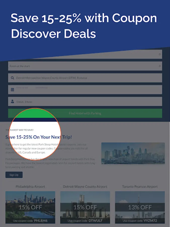 This is the official ParkSleepHotels.com app. You’re now able to save on park stay fly package deals with this app. Save up to 30% on your vacation when booking parking + hotel together* with free shuttle service to and from the airport.
