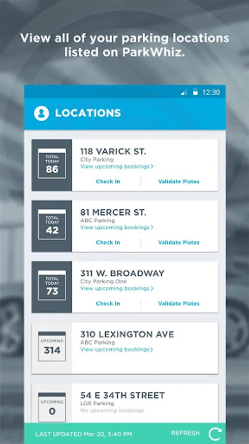- View current and future bookings at all of your parking locations listed on ParkWhiz