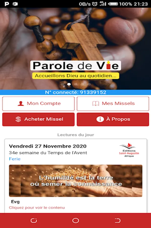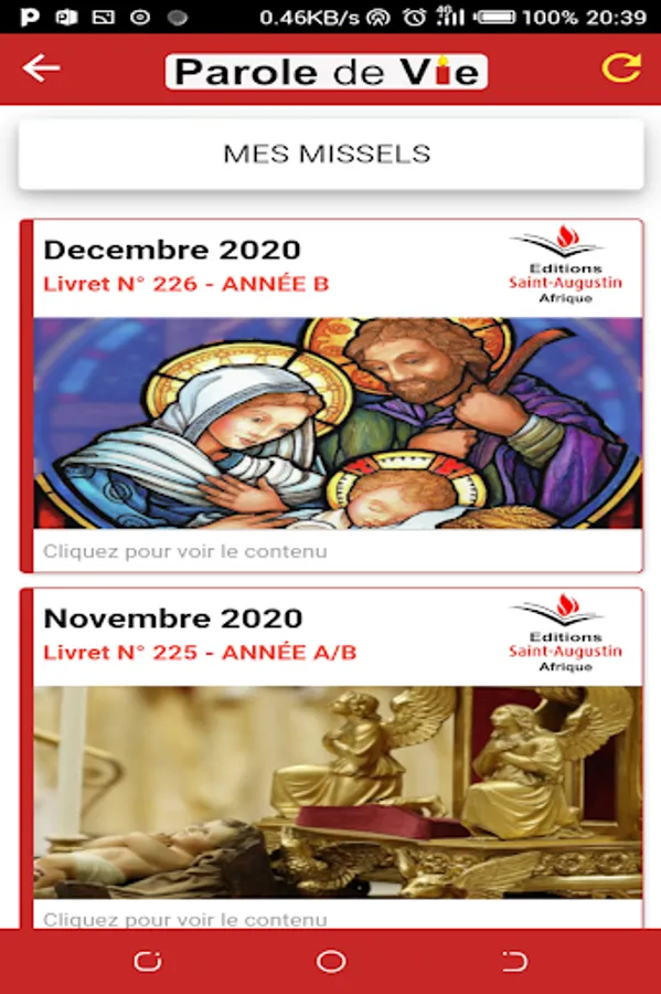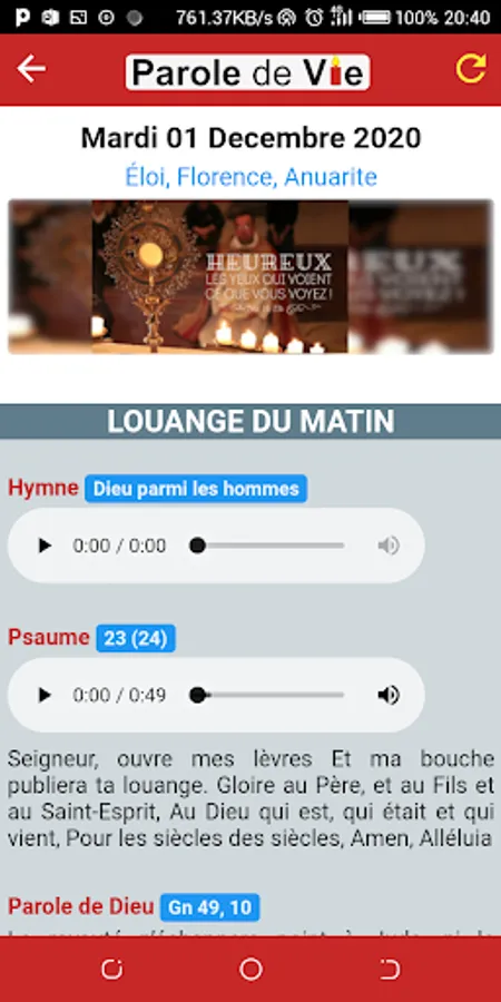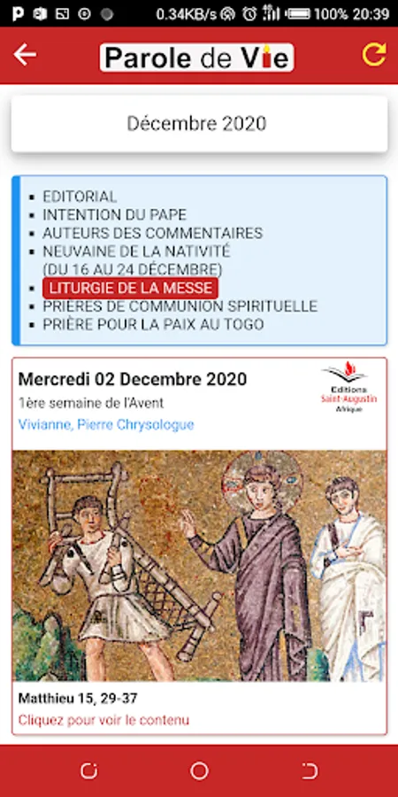 Elle contient les lectures liturgiques de chaque jour et des messes. L'application offre des contenus et services reservés aux abonnés. Les psaumes, cantiques et hymnes sont proposés en version audio.