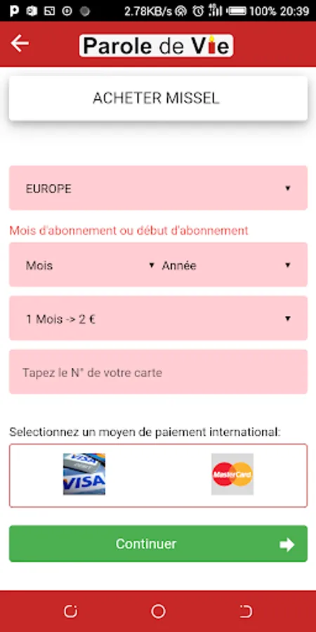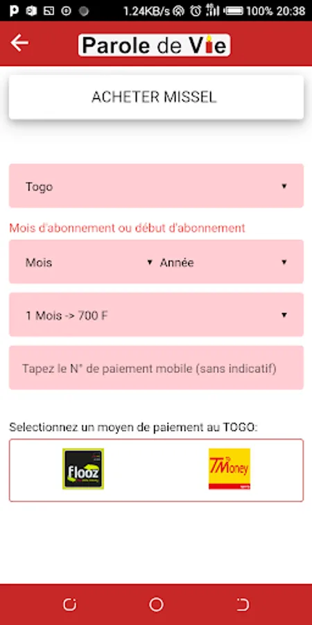 L’ abonnement se fait dans l’application via les portefeuilles mobiles (Flooz, Tmoney, Orange Money, MTN Money, Moov Money et Visa / MasterCard).
