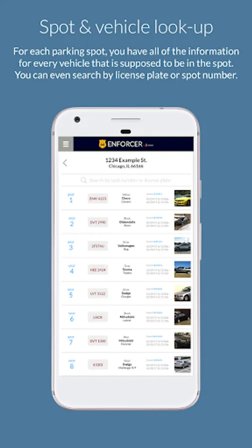 - Search by license plate, vehicle make or model, reservation number, or parking spot.
