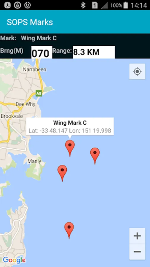 The app will chart the position of the Marks and will allow the user to select the current distance and bearing to the selected mark.