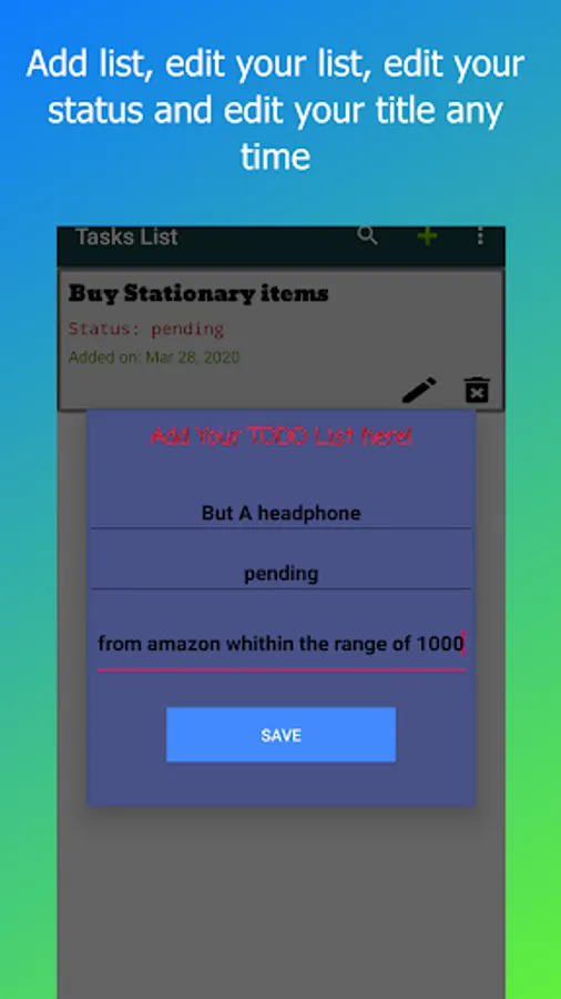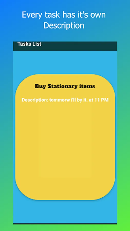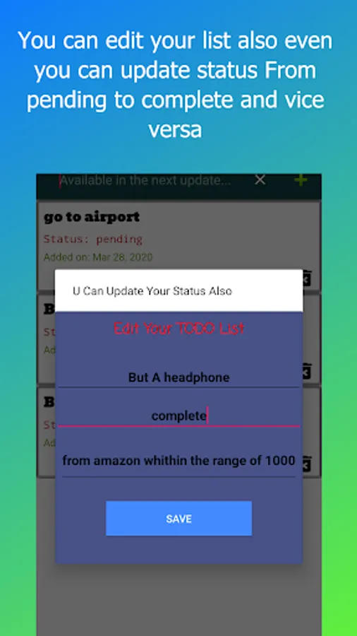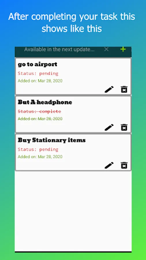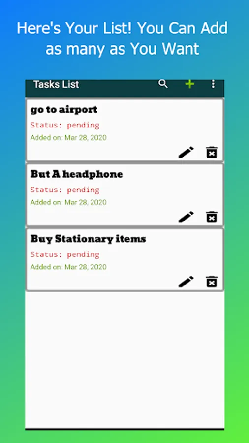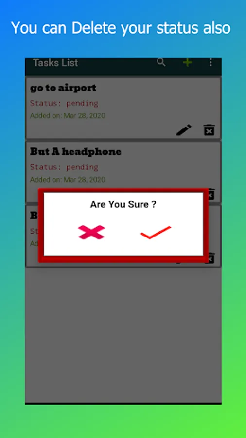 3. App have the details of the task and a status. Pending or Complete.