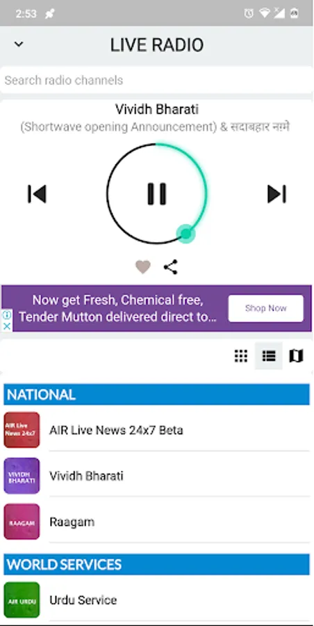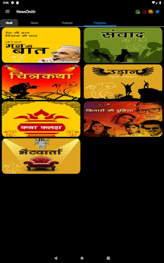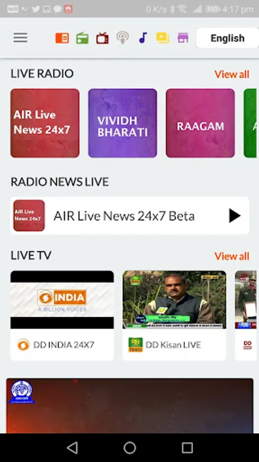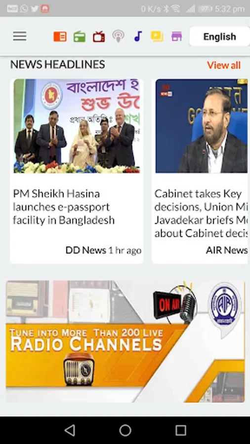 The official Prasar Bharati app brings you 230+ Live Radio channels, Live TV, News, Current Affairs as well as Entertainment programs (text, podcast and videos) from Akashvani/ All India Radio (AIR) and Doordarshan (DD) networks in India. This App is the first step by Prasar Bharati, India's Public Service Broadcaster, towards creating a truly global digital platform.