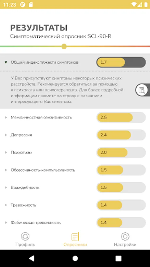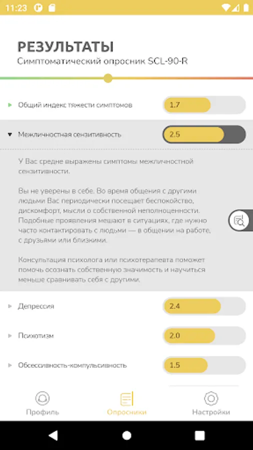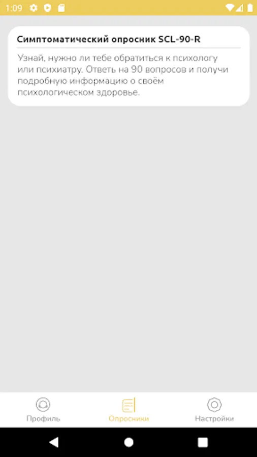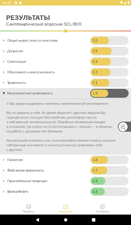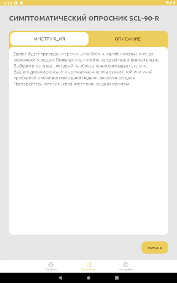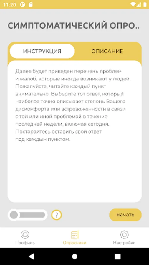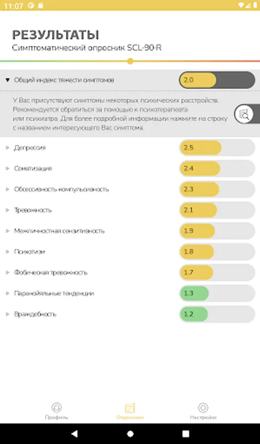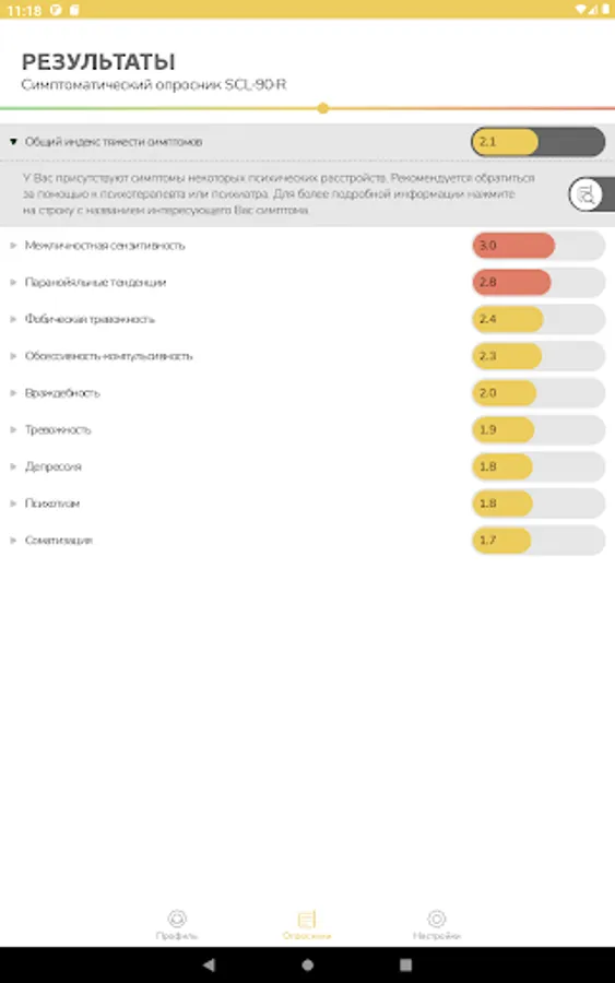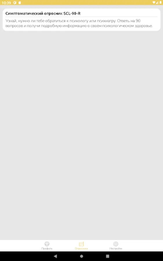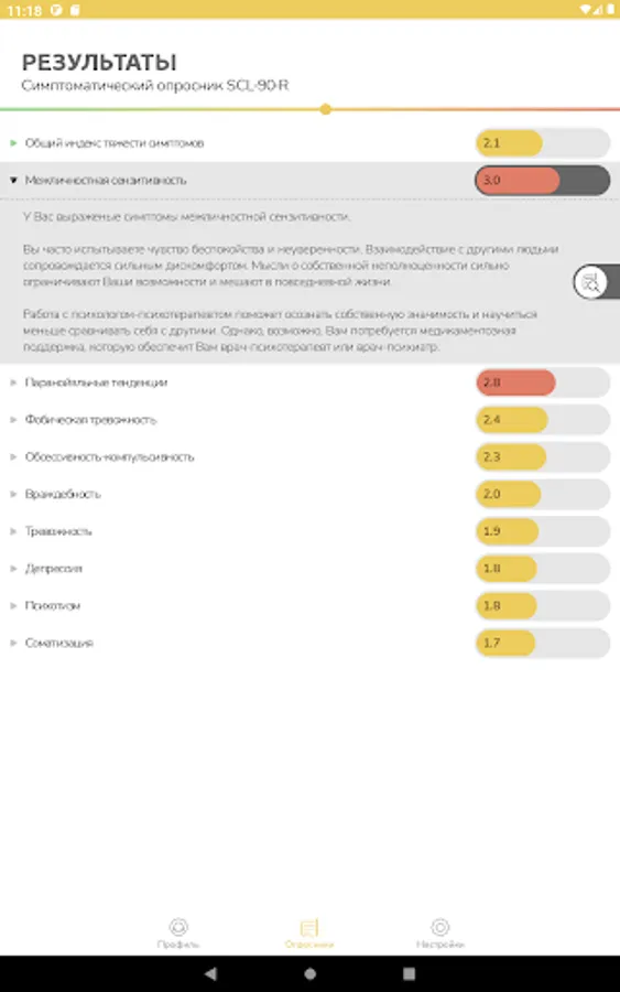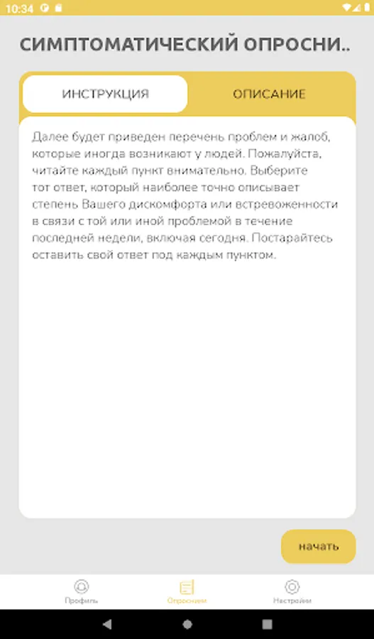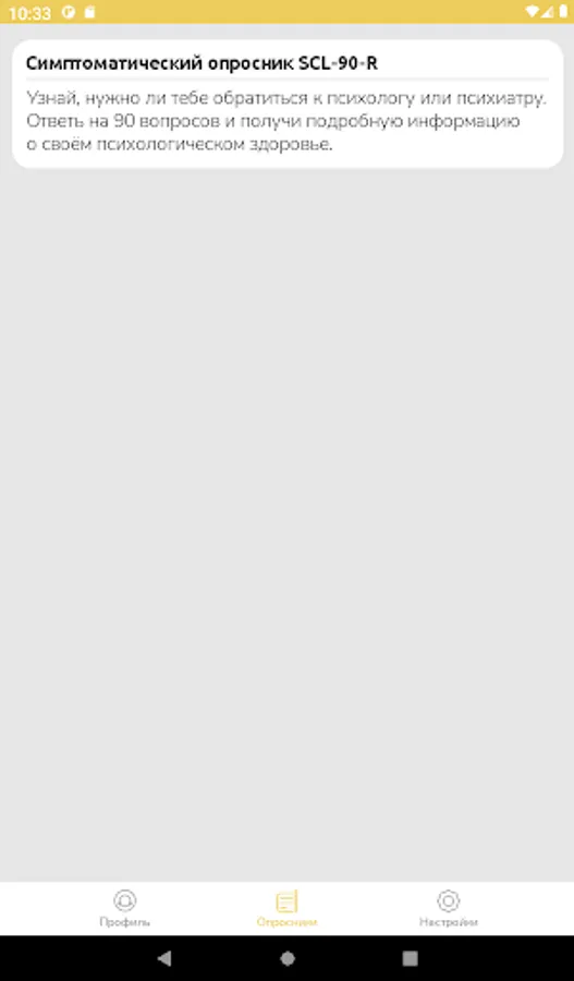 This application is an evolving platform, the main task of which is to provide access to science and practice proven medical and psychological questionnaires and tests. We do not have advertising and the imposition of specific specialists. All information received as a result of completing the questionnaires is completely confidential, and only you have access to it.