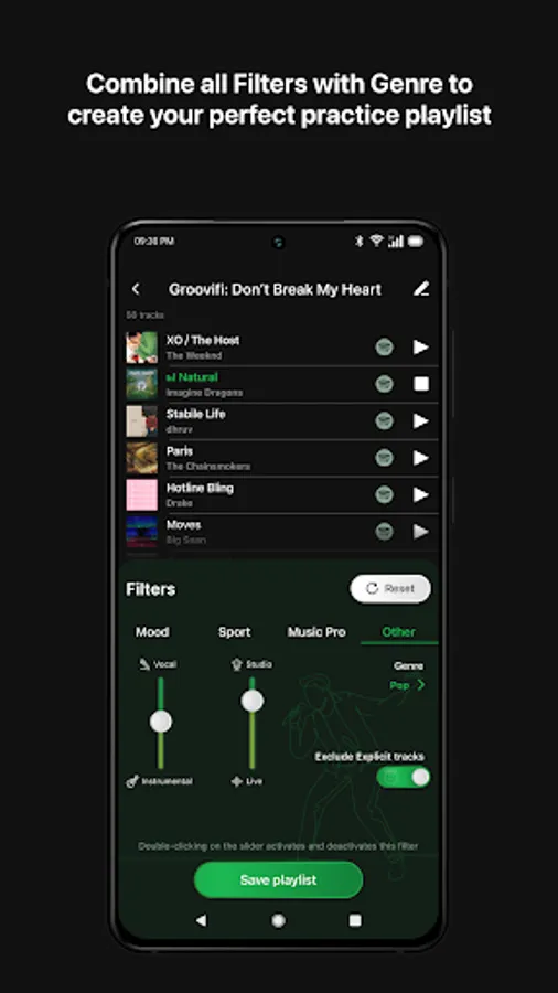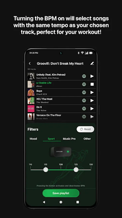 Your Music, Your Style, Your Sound - Take your Spotify playlists to the next level. Create a playlist of your own personalized sounds, tuned right to your favorite mood, genre, BPM. Search like a pro by setting your musical key, mode (major / minor), and even meter. Tune the playlist to your heart's content, and when you are ready - simply save it to your Spotify account.