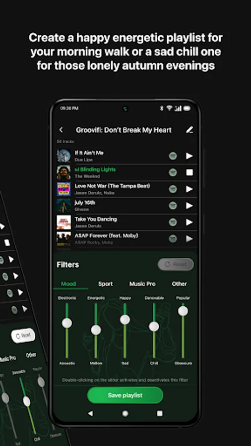 Playlist for any mood - Do you want to create a playlist for your evening jog? We have got just the thing for you. Are you sad and need some good music to chase away your bad mood? Look no further! Let Groovifi work with the Spotify algorithm to create tailor-made playlists for you!