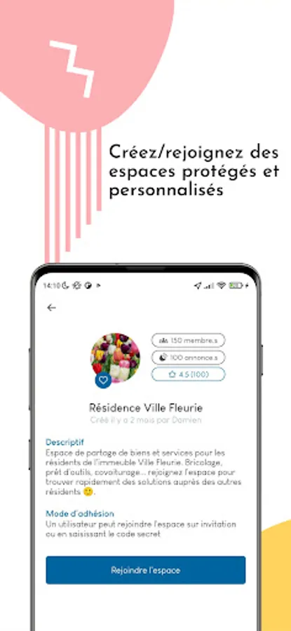 Do you live in the same building, go to the same school, work for the same company or simply have common interests? Create a space quickly with PartageOn and start exchanging classified ads between you. Entry to a space is conditional on a secret code or the presentation of proof, thus guaranteeing you to interact only with trustworthy people. PartageOn also uses geolocation to offer you the ads closest to you.