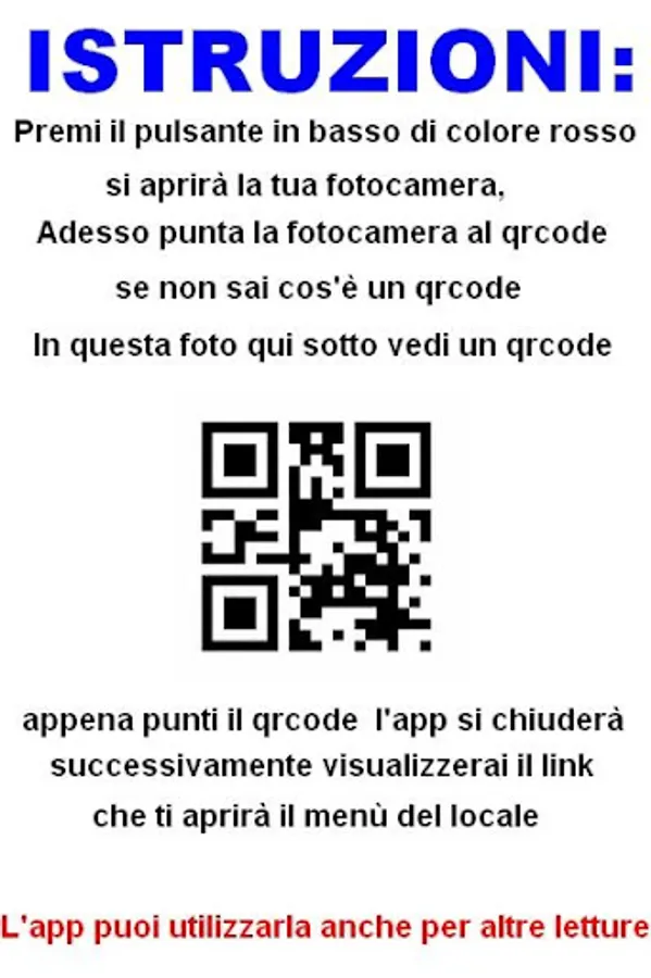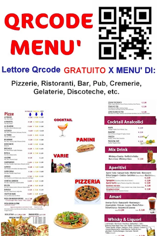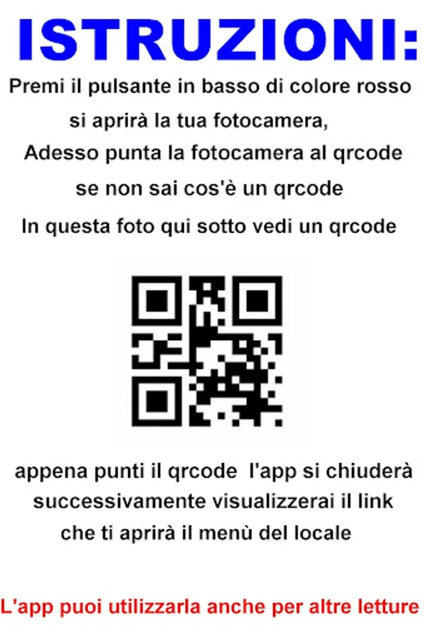QrCode Menù is a free app that allows you to read all the QR codes, including the menus of clubs such as: pizzerias, restaurants, bars, etc. and to view the menu in the formats they have provided ( PDF, JPEG, Etc. ) this depends on the venue not on our app.