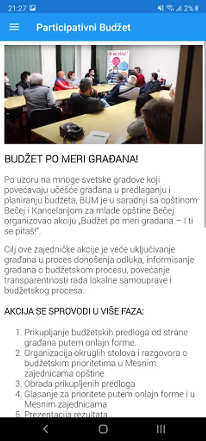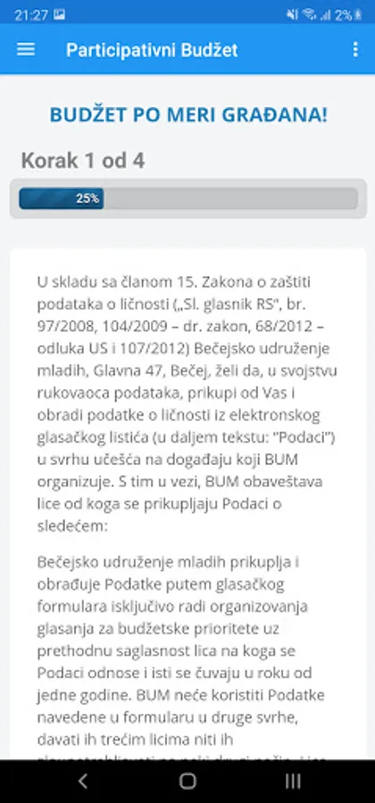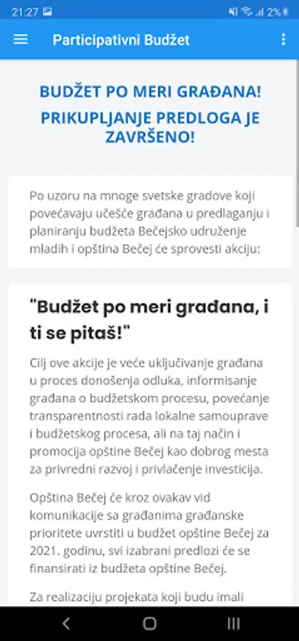 The Android application "Participatory Budget" was created for the needs of the action of improving the participation of citizens in the budget process "Budget tailored to citizens - And you wonder!", Which is implemented by the Becej Youth Association in cooperation with the municipality of Becej.