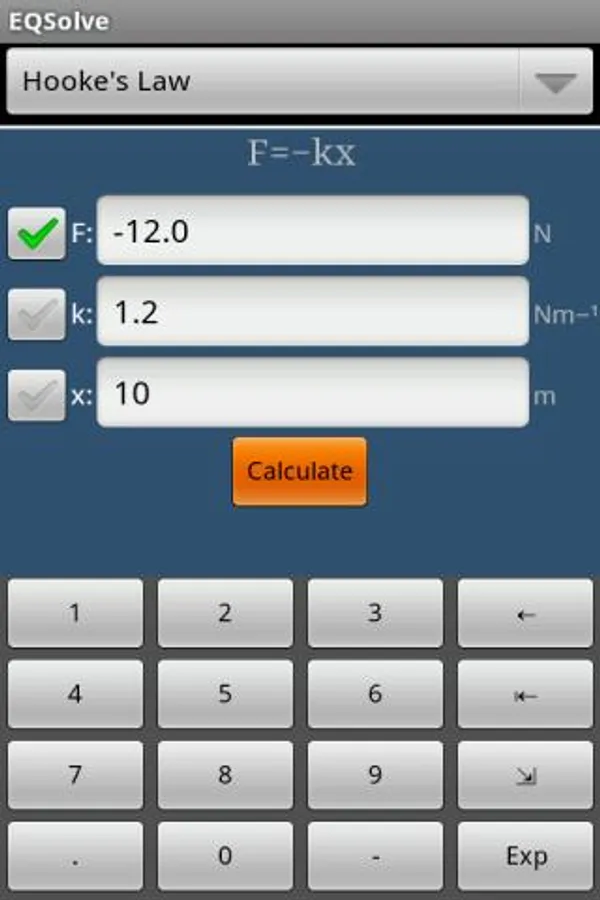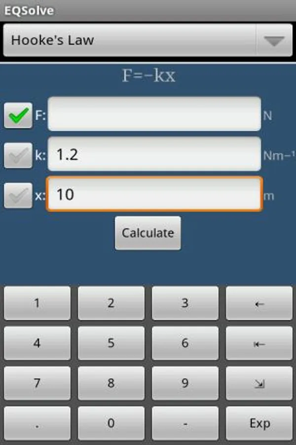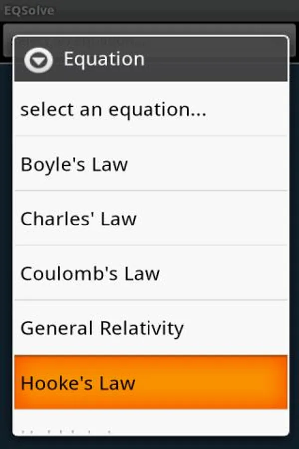 EQSolve is designed for those times when you need an answer to a well-known equation quickly. Instead of having to remember the equation you're working on, rearranging the terms and then calculating each part separately with a normal calculator, EQSolve does it for you. Simply select the equation you want to use, choose the variable to calculate, fill in the known variables and calculate the answer. No more pen and paper!