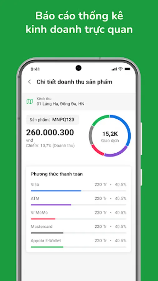 Statistics and reports on revenue by branch or service; real-time reporting of successful and failed transactions, helping Merchants get real-time metrics on business performance.
