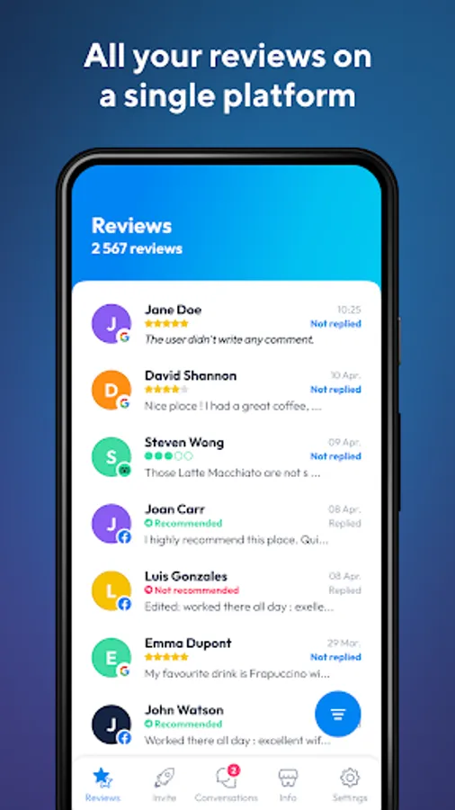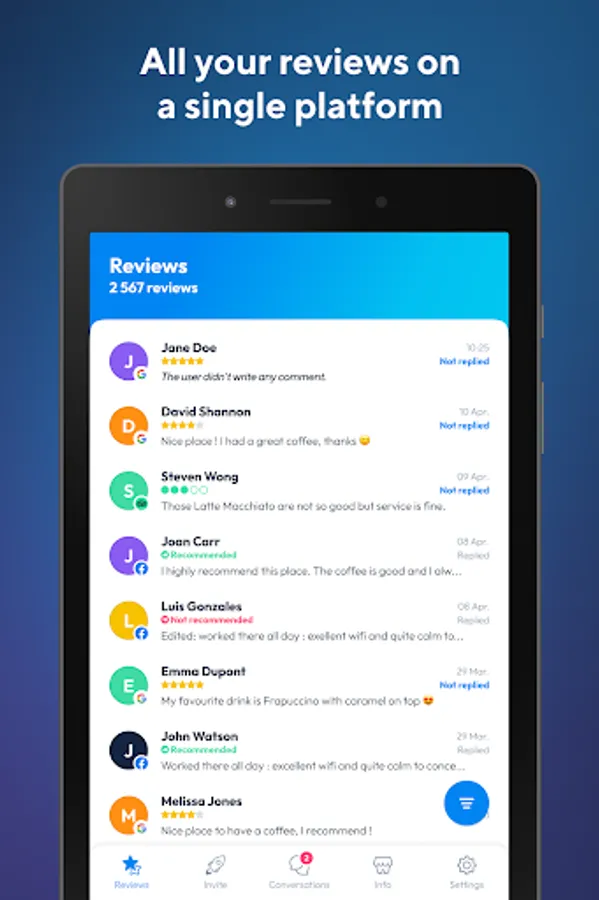 Get a notification every time you receive a new review on Google, Facebook or TripAdvisor and reply quickly with customised templates