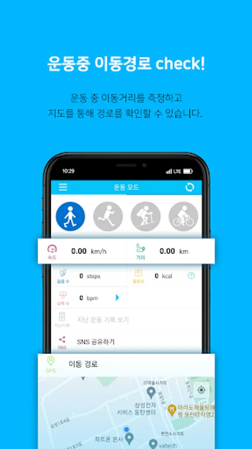 The user can select and proceed with the exercise, and informs the user of the movement route, distance, calories consumed, heart rate, etc. during the exercise.