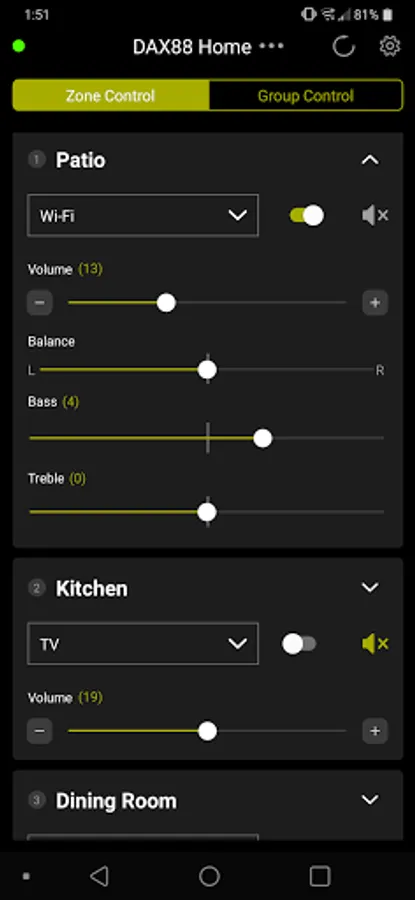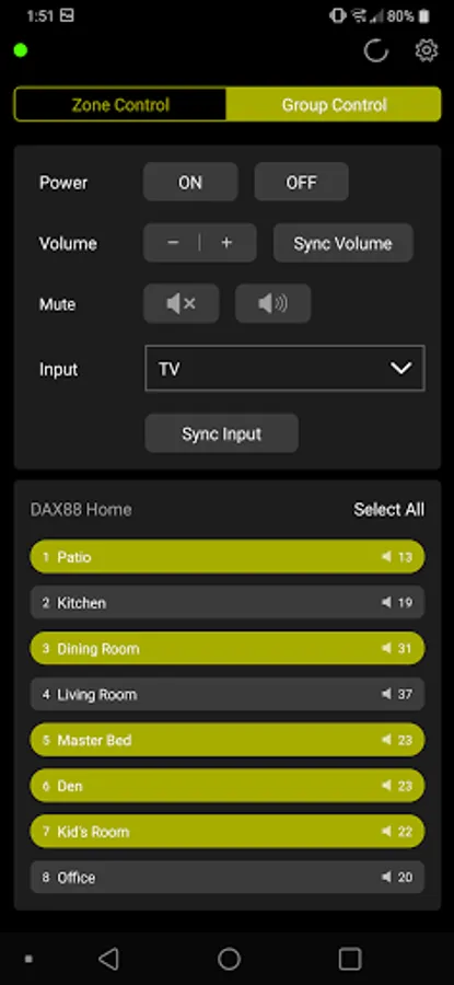 In addition to individual zone control, Matrio™ gives you the ability to group multiple zones for streamlined command. The Group Control menu allows you to adjust all possible zone settings, including power on/off and mute on/off. From the menu, you can also sync volumes and input sources across grouped zones. Choose any combination of zones from all DAX88 units on your network for custom group control.
