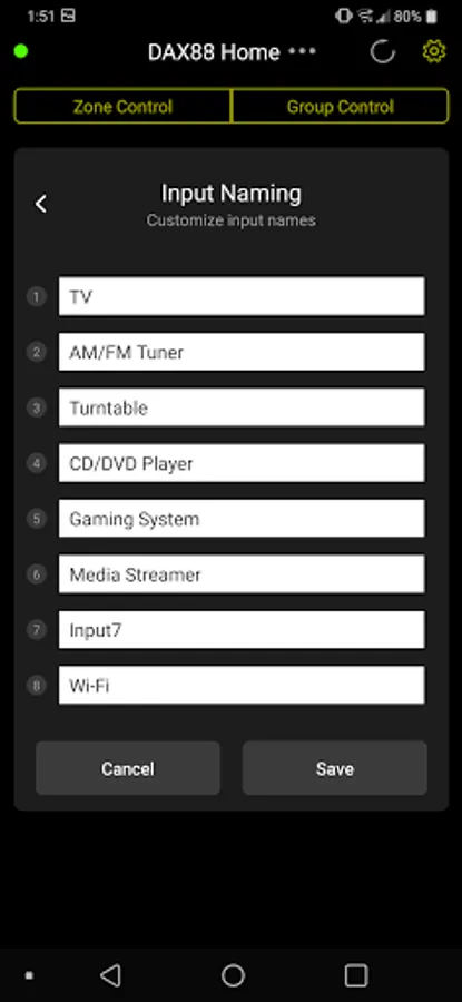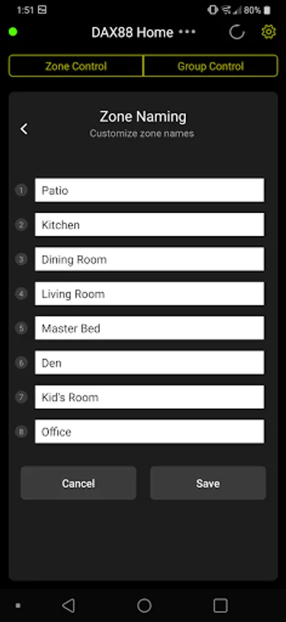 Customize all of your source, zone, and DAX88 device names to ensure that you can quickly identify zones and inputs. Name each of the eight zones to keep track of what zone you are controlling. Custom zone names help when grouping zones together to ensure you select the correct zone combination. The custom names, changeable at any time, appear in Matrio™ for all users on your network.