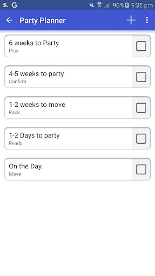 The app features step by step items to remember and take care all the way 6 weeks before the party. It has things to do 4 weeks to party, 5 days to party, 2 days to party and even what to do on the day of the party.