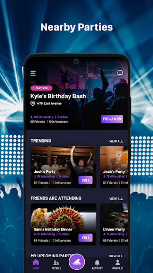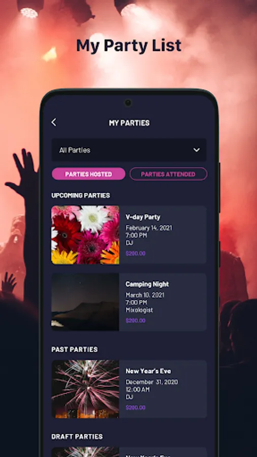 PartyShark has a party creation process that will give you the tools to set up your party along with access to various vendors you might need (DJs, bouncers, food trucks, etc..). There will be options for hosts to hold both Public and Private parties for friends. All users are PartySharks and can host one day and party the next!