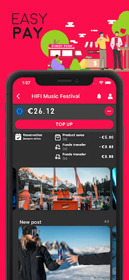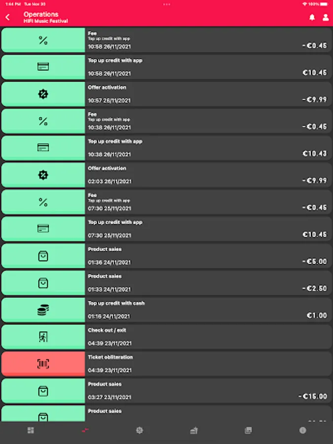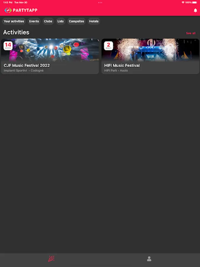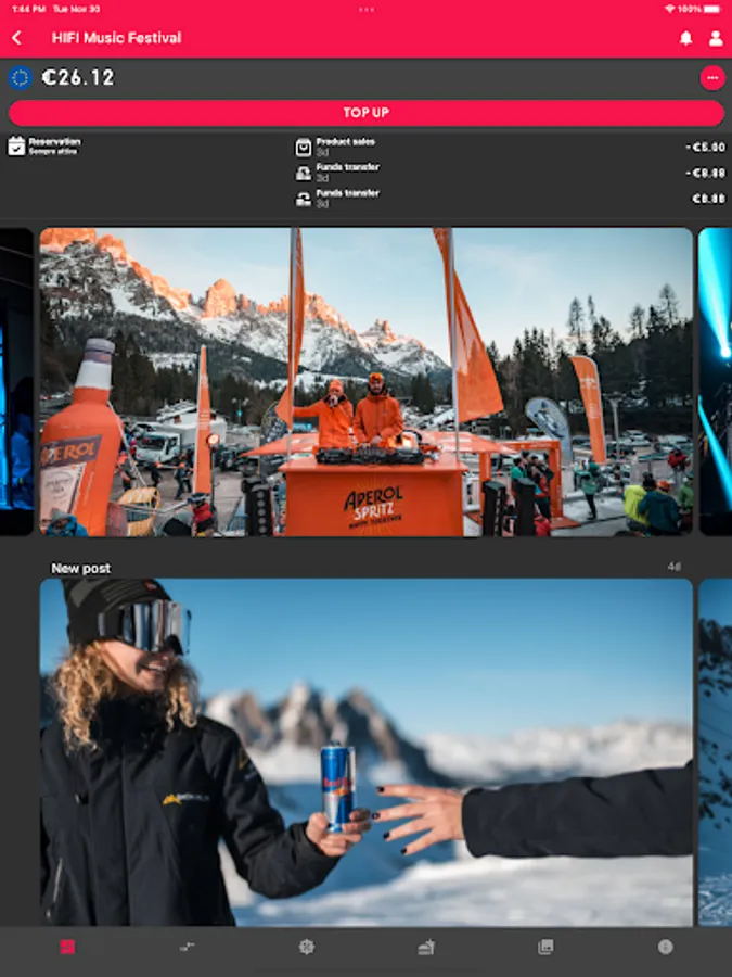 Partytapp is a social network dedicated to entertainment, here you will find all the festivals, clubs, hotels and campsites that use our platform. For each activity you connect to, you will have a digital wallet that can be used for purchases.