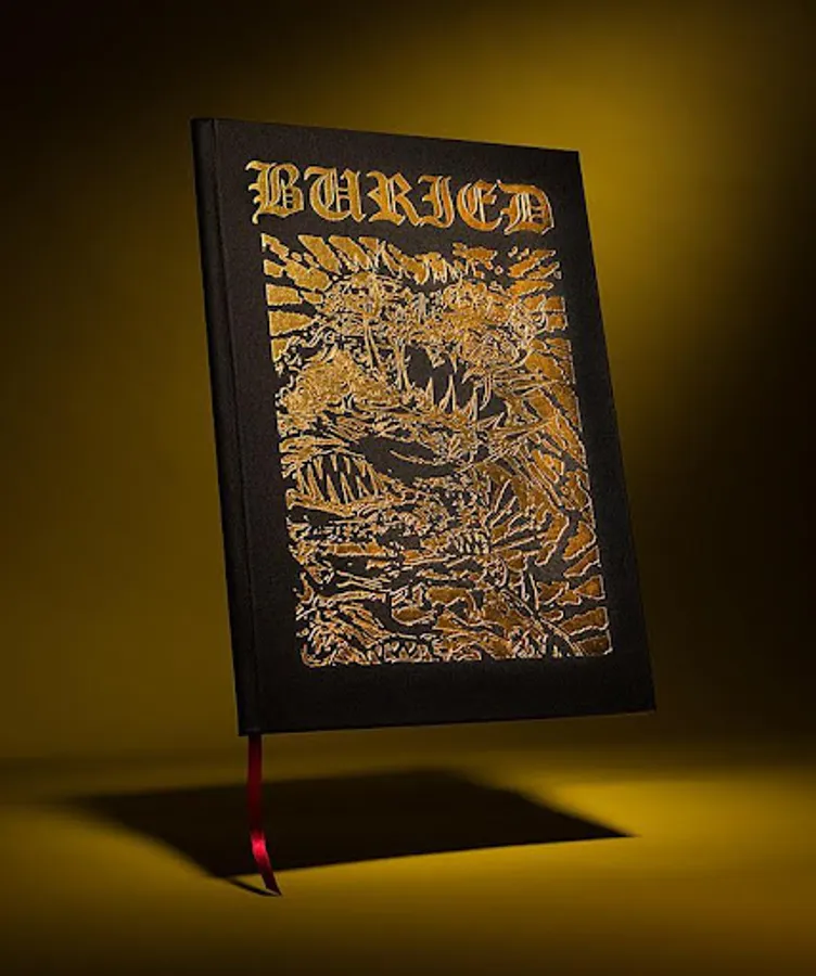 Buried is a Fanzine like no other, something akin to a publication from William Morris’s Kelmscott Press, albeit one drenched in gore. Each meticulously produced issue is hand bound and filled with original interviews, illustrations and commissions. The production values aim to be a fitting platform for the craft of the metal and commissions included within.