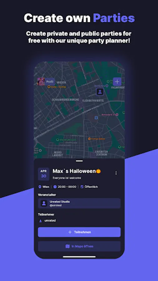 Our app also boasts a user-friendly and intuitive interface, making it easy to search for events, find friends, and communicate with them. We've prioritized a seamless user experience, allowing you to focus entirely on the party.