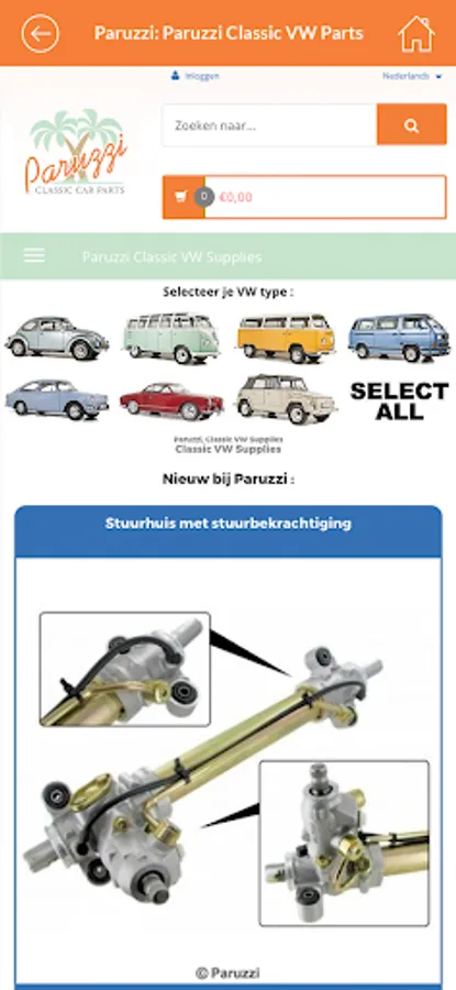 Paruzzi sells parts for all aircooled VWs: Beetle, Karmann Ghia, Type 3, Type 181/Thing, split screen vans, bay window vans and T25 vans.