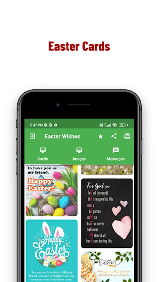 'Happy Easter Cards Maker' app provides you make your custom cards and messages as your wish for Edit Cads, share Cards, copy Message and Download Cards and share to social media like, Whats app, Facebook, Instagram and other social media.