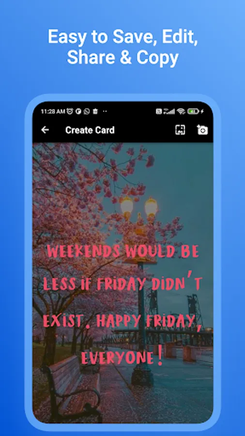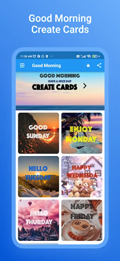 'Good morning Message and Wishes' app provides you Good morning Images, Good morning Cards, Good morning Message, Good morning Quotes, and Good morning Create custom Good morning Cards for share copy and Download Good morning Wishes on Whats app, Facebook, Instagram and other social media.