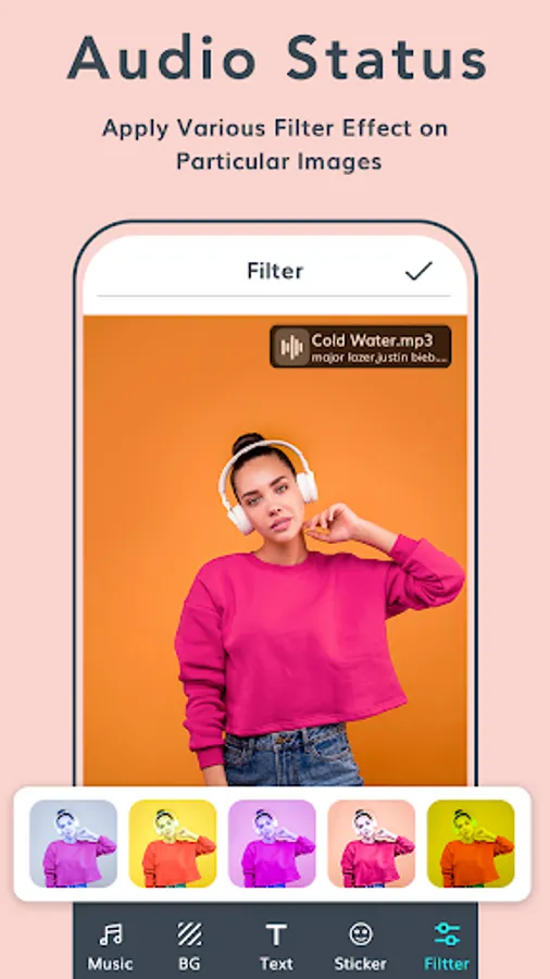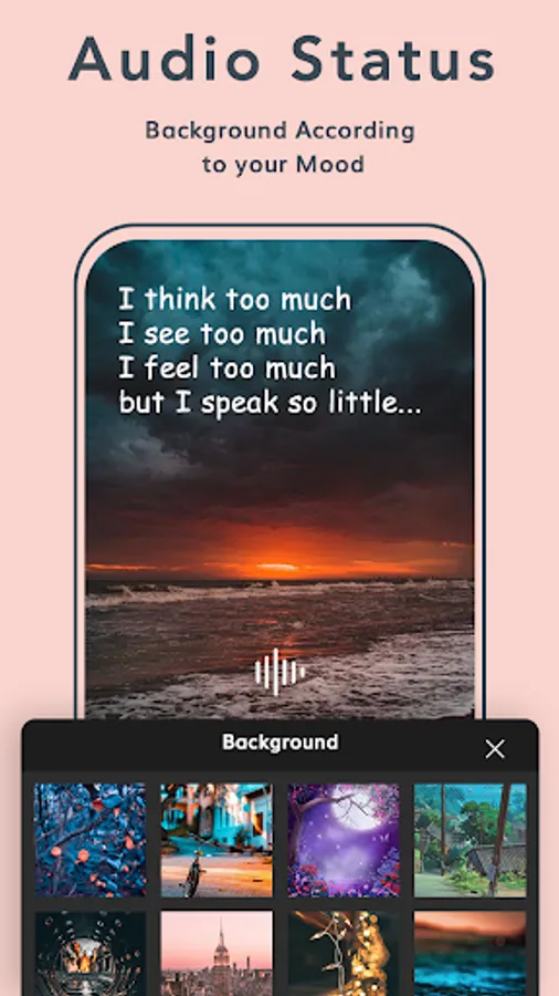 Audio Status Maker - Story Maker, you can pick or record audio from your library, trim the audio to pick the part that you want to share and then convert it to an audio status by either choosing from a selection of several backgrounds available in the app or use your own custom image as the background. You can then show off your creativity by adding text, stickers, filters or drawings on top of your status to give it that extra edge. You can share this status on WhatsApp or any other social media platform and it will work!