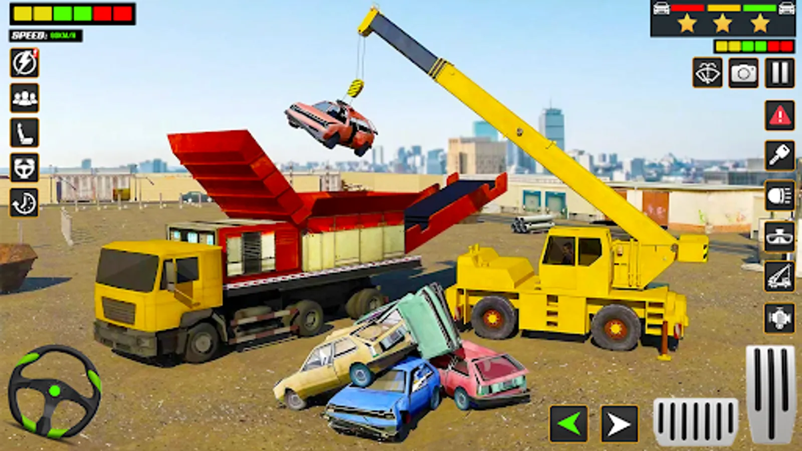 Scrap car crusher crane has extreme shredder machine that crush and demolish wrecked cars. Become heavy crusher operator for transforming wrecked car into scrap bits. The impossible car shredder has a grinder with crushing machinery surrounding it. Show eagerness of crushing junk cars with majestic crane operating missions and garbage truck driving. Operate magnetic grapple crane to lift rusty cars and drop them in car shredder. Turn on crusher machine to demolish rusty cars into scrap bits. Collect scrap metal in dumper truck and transport junk to a dump site for recycling purpose. Drive cargo pickup truck from auto repair shop to junkyard and continue crane missions while crushing wrecked cars.