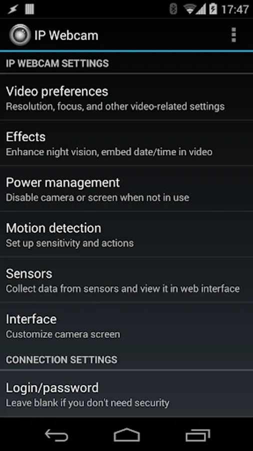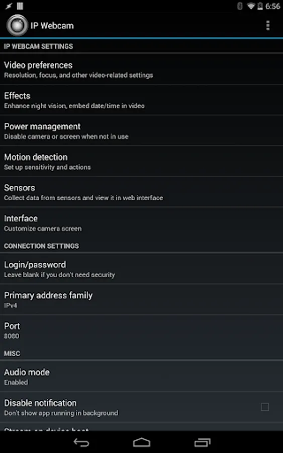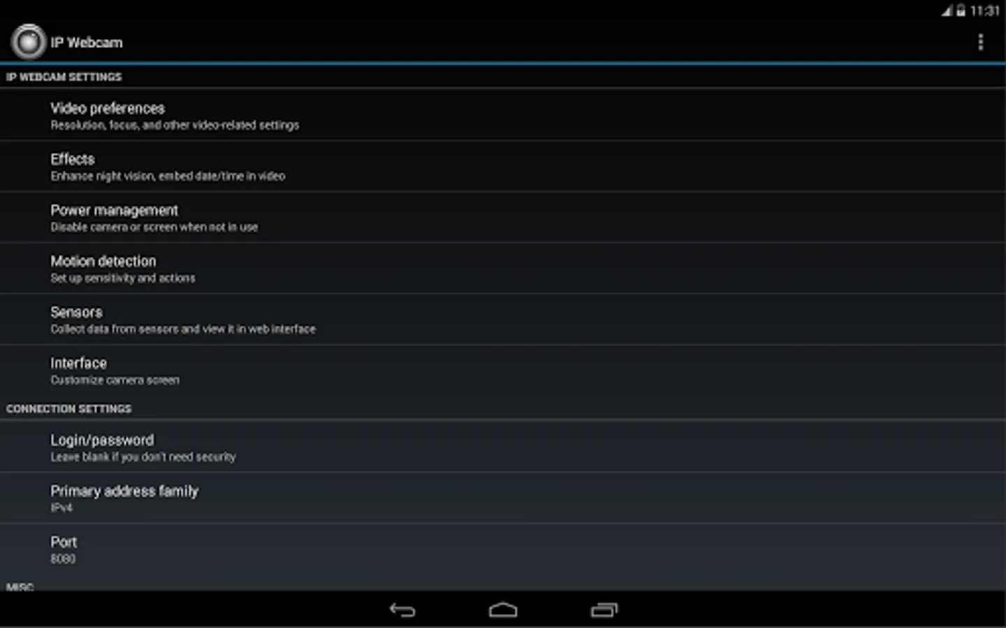 IP Webcam turns your phone into a network camera with multiple viewing options. View your camera on any platform with VLC player or web browser. Stream video inside WiFi network without internet access.