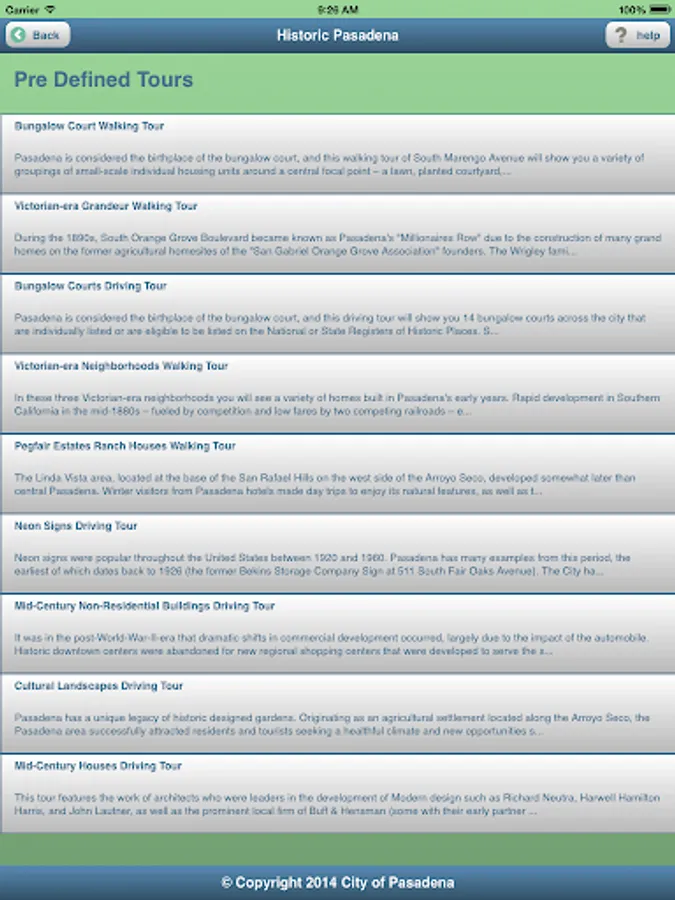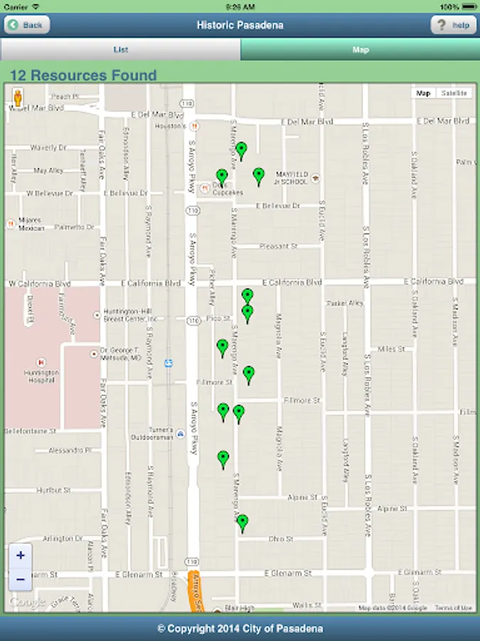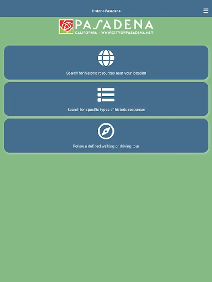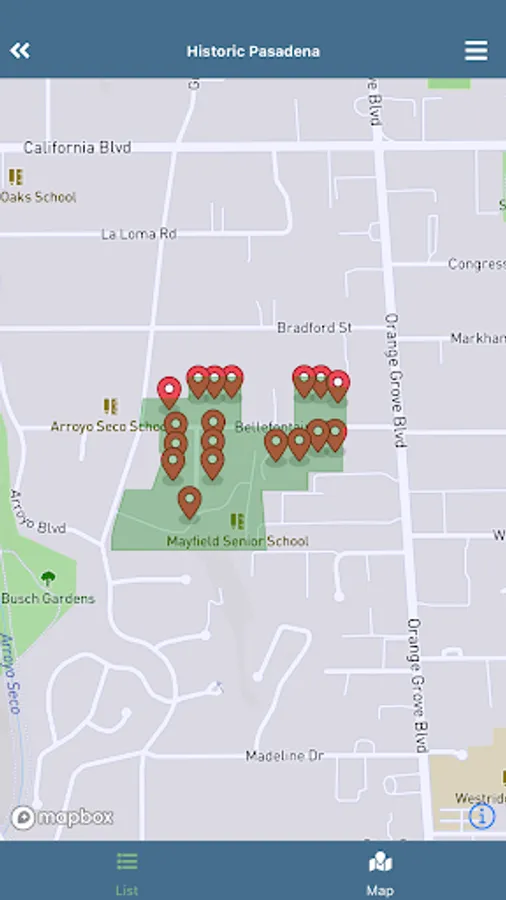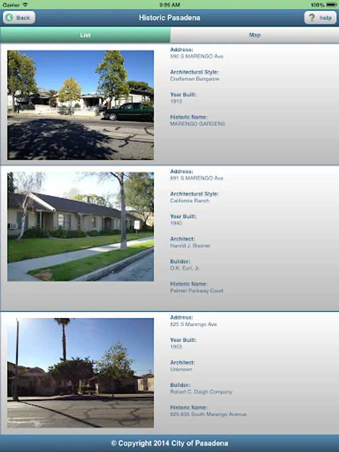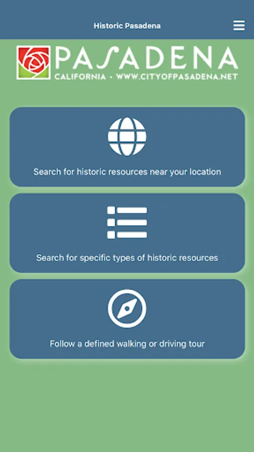Historic Pasadena is a mobile app that provides anytime access to information about historic resources in Pasadena. With this app, you can search for any historic resources near your current location, search for specific types of historic resources, or follow a pre-defined walking or driving tour developed by the City’s historic preservation staff (and, in the future, by other local groups such as the Pasadena Convention and Visitor’s Bureau). Tours developed for the initial release of the app include lesser-known historic resources including buildings from the mid-century modern and Victorian eras, bungalow courts, neon signs and historic gardens. Future tours will be developed for more commonly known historic resources such as buildings from the Arts & Crafts and Period Revival eras and historic districts such as Bungalow Heaven and Old Pasadena. The app provides map and text directions (including transit) from your current location to the historic resource of your choice and allows you to access information about the resource such as date of construction, original architect, and an explanation of the resource’s significance to the history of Pasadena. Download the app today and connect with Historic Pasadena!